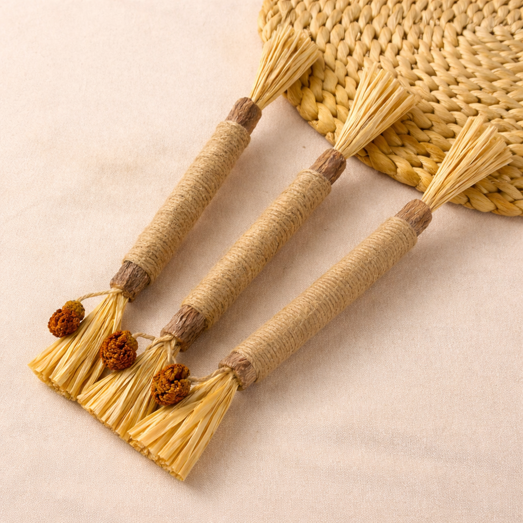 Hver pinne er gjord av naturligt, obehandlat silvervineträ och knyts for hånd med gallfrukt och fibrer. Det betyder, at ingen er nøjagtigt – og det er en del af det, som gør dem unikke. Små variationer i form, farve eller størrelse er helt normalt.